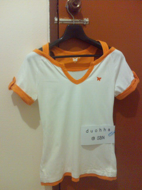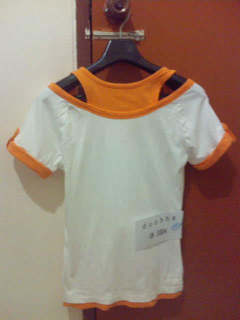 ตัวที่ 4 เสื้อ AIIZ size S ตัวเสื้อสีขาว มีสีส้มสดใสด้านใน คล้ายใส่เสื้อกล้ามด้านในด้วย (แต่เป็นตัวเดียว ติดกัน) ตัวนี้ดูใหม่มาก ของแม่ค้าเอง ซื้อมาได้ใส่ไม่เกิน 2 ครั้ง เพราะมันฟิต (อีกแล้ว)