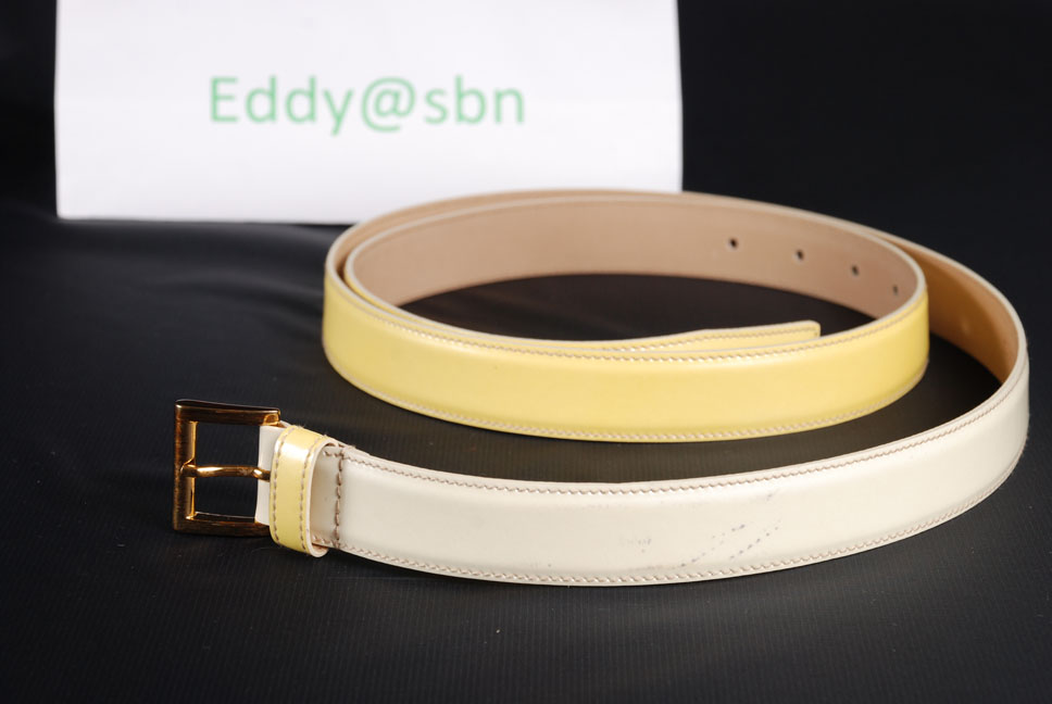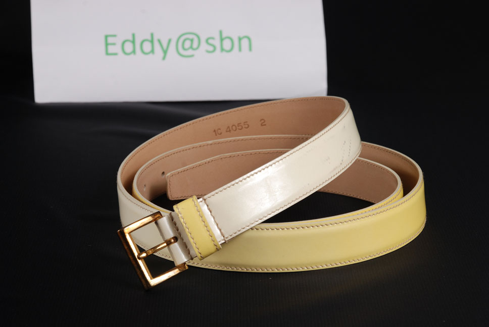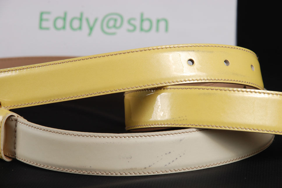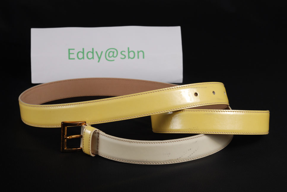 เส้นแรก เป็นหนังแก้ว สี เหลือง แบบ ไล่ ระดับ เลื่อม ( Prada คิดได้ไง) มองเผินๆ นึกว่า เอาลูก งูเหลือม มา รัด เอว ไซส์ 95/38 เอว 36 ลงมา ใส่ได้ อีกทั้ง มี ที่เหลือ อีดเยอะ สำหรับ คนเอว ใหญ่ กว่า สบายๆ มือ 1หมื่นกว่า ไม่ขาย ขาย 4,350 บาท